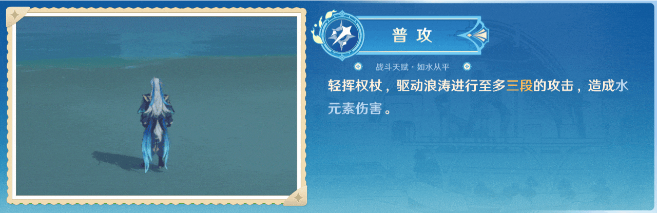 A有三个动作,每次命中敌人都会造成水元素伤害。它的附着能力受到附着CD的影响,大约2秒。A具有附着能力,每次命中敌人都会施加弱水附着效果给敌人。