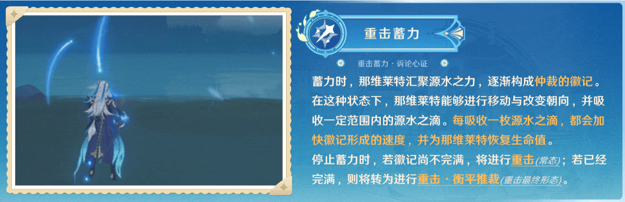 触发重击的最终形态由重击的蓄力机制支持,分为常态下的超长蓄力和吸收「源水之滴」(简称“水滴”)的瞬间释放两种模式。