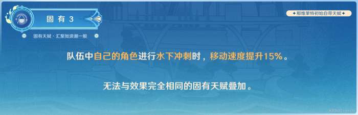当那维莱特加入队伍时,队伍中的其他角色在水下持续按住冲刺键可以获得增加移动速度的效果。但是,在联机游戏中,队友无法享受到这个效果。