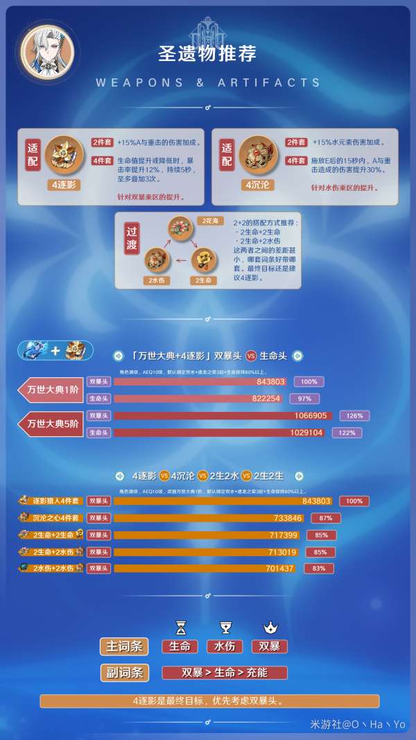 目前在圣遗物方面,最终目标是获得4件套的逐影套装。如果现在没有逐影套装,可以先用成型的4件套沉沦套装过渡。如果连成型的沉沦套装都没有,可以使用混搭方式,选择使用2件套的生命和2件套的水伤,不管是2生2水、2水2水还是2生2生,最终差距只有2%。选择哪套词条好,就优先使用哪套过渡,主词条最好选用生命和水元素伤害的暴击率,副词条优先选择主属性双倍率和次要属性生命。但是,需要根据角色阵容和武器的不同搭配,生命头和生命词条占比的情况会有所不同。以上只是笼统的大方向。