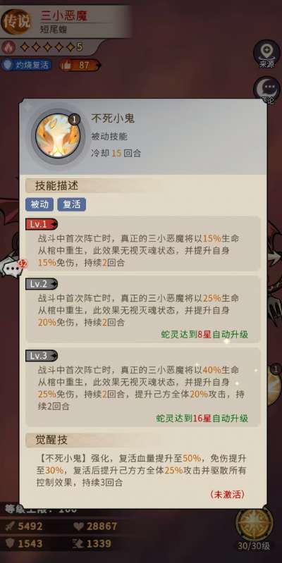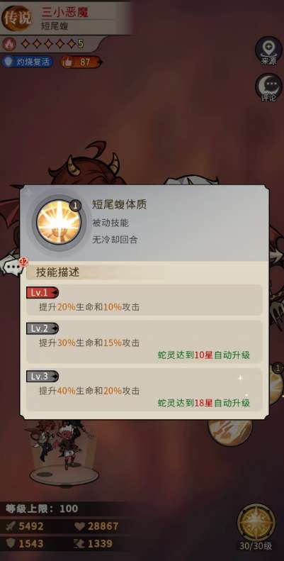 短尾蝮体质作为基础的被动技能,在其中主要是可以提升20%的生命数值以及10% 的攻击效果,而后期想要这个数值更高,只能从升级技能上面下功夫,只要三小恶魔提升到了18星的话,这里的数值就会变成40%生命和20%攻击了。