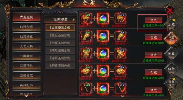 1)合成-神装锻造-大圣圣装,可以用低级的进行合成更高的大圣装备,合成的材料可熔炼多余的大圣装备进行获得,这里注意灵胎合成出世的有成功率,每次失败后会提升下次成功几率,后面等级的只有材料足够都是必定成功;