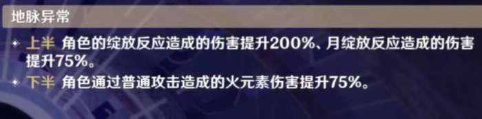 6.1下半深渊BUFF当场上角色的生命之契数值提升或者降低时,将释放冲击波,12层的BUFF上半:绽放反应伤害提升200%,月绽放反应伤害提升75%,下半则是普通攻击的火元素伤害提升75%。