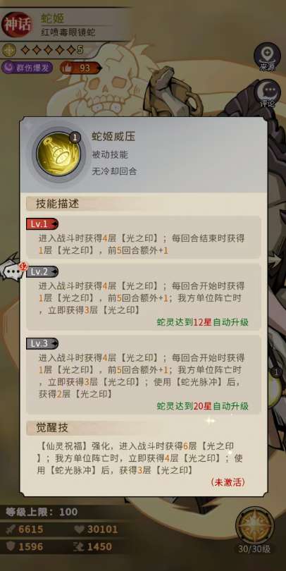 她最后可用的被动叫做蛇姬威压,这个技能也可以让她再次叠加自己身上的状态,进入战斗的时候蛇姬自己身上就会自动获得4层【光之印】叠加,且在每一个回合结束她还可以获得1层【光之印】,而在前5个回合结束之后还有额外+1层的叠加机制,后期的仙灵祝福强化之后,就会变成一开始进入战斗直接获得6层【光之印】,而在我方有队友阵亡的时候,可以获得4层【光之印】,在使用蛇光脉冲招式之后,她会再次获得3层【光之印】进行叠加。