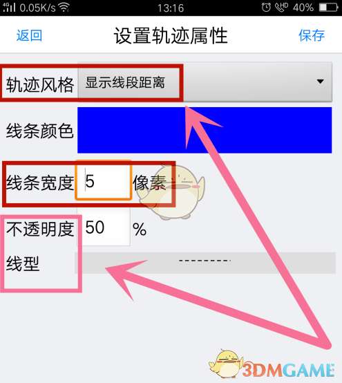 5、在设置轨迹属性中,可以对轨迹的式样风格、颜色、线条宽度等进行设置,点击保存即可。