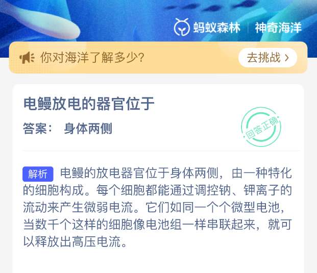 软件提交 专题合集 热门手游电鳗放电的器官位于?【神奇海洋】2026年3月19日新题目已开答!正确答案现已公布,点击领取拼图,一起为修复海洋生态贡献力量!今日正确答案是:【身体两侧】。电鳗的放电器官位于身体两侧,由一种特化的细胞构成。