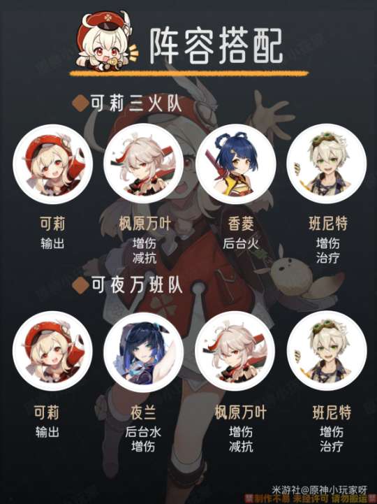 ① 可莉三火队: 可莉+万叶+香菱+班尼特