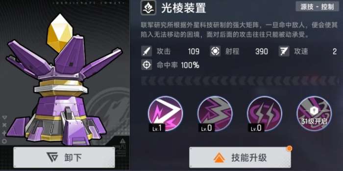 源能类防御塔算是后期的主力输出,光棱装置绝对是这里面的顶流,它攻速快伤害高,一技能能麻痹敌人,二技能还能加伤害,1级天赋带的攻击折射效果,让它打群怪也不费劲,中后期关卡里精英怪大多是重甲,光棱装置打重甲伤害很稳定,既能当主力输出扛伤害又能偶尔控一下敌人,不管是单放还是扎堆摆,效果都特别好几乎是每个玩家必带的塔。