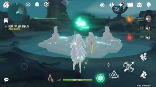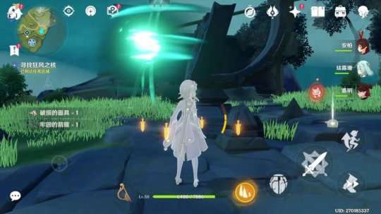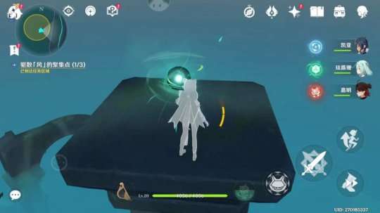 我们先拿正前方的,沿着标记走后看到一个青色的晶球,我们用风元素将它吹散。吹散第一个之后任务刷新,叫我们去吹散其他三个晶球