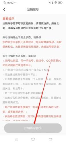 4、查看账号注销相关的说明,等待下方倒计时结束后,点击“注销账号”;