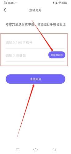 5、然后通过注册的手机号获取验证码并输入,再次点击下方的“注销账号”;