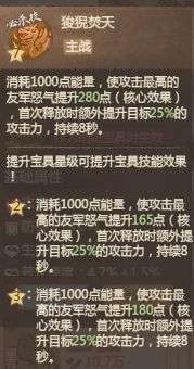 1、消耗1000点能量,使攻击最高的友军怒气提升165点(核心效果),首次释放时额外提升目标25%的攻击力,持续8秒。