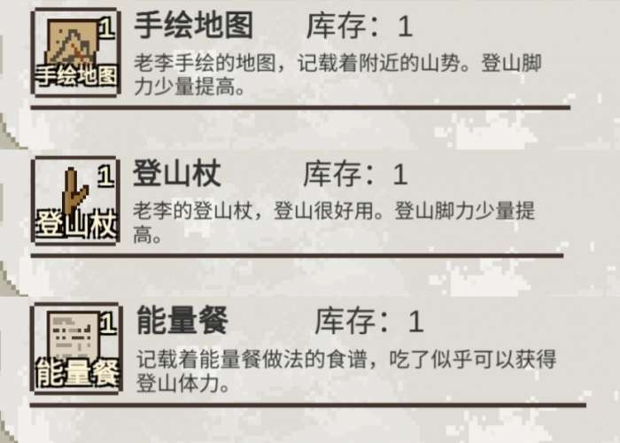 李二狗:问路BUFF,登山体+15(限当日) 登山:需买压缩饼干或军用干粮