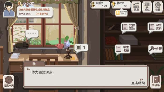 办公室:概率刷猫,撸猫+10体;接委托任务; 名气>200,假期家访