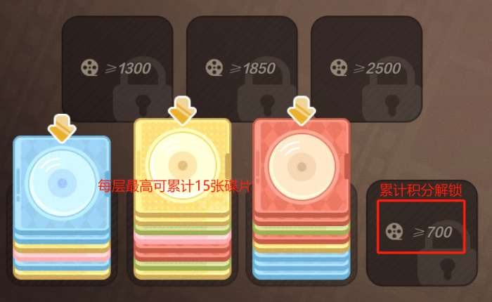 放置区域,可以叠加相同颜色的碟片,也可以将碟片放到空位置上(参考彩砂小游戏的移动、叠加),每一打碟片最多可叠15张碟片。当累计获取相应【影像积分】解锁空位置。