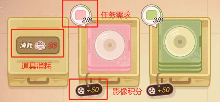 收纳盒区域,消耗道具【影音标签贴】解锁收纳盒,完成收纳盒需求颜色数量的碟片即可获得【影像积分】,用于领取对应奖励。