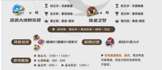 圣遗物主属性选择精雷暴,副属性优先双暴,其次是精通、充能和攻击力。