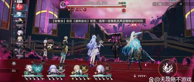 3、(提前说一下,带「阮梅」打boss的开拓者,不要开启「阮梅」的终结技)进入战斗后,boss在第一次行动的二动就会获得【基因复制】状态,召唤四只「幼蛰虫」并让玩家选择一名角色和角色的忆灵拉条,然后被拉条的角色获得【天敌】buff(只有【天敌】buff的角色才可以造成暴击伤害)
