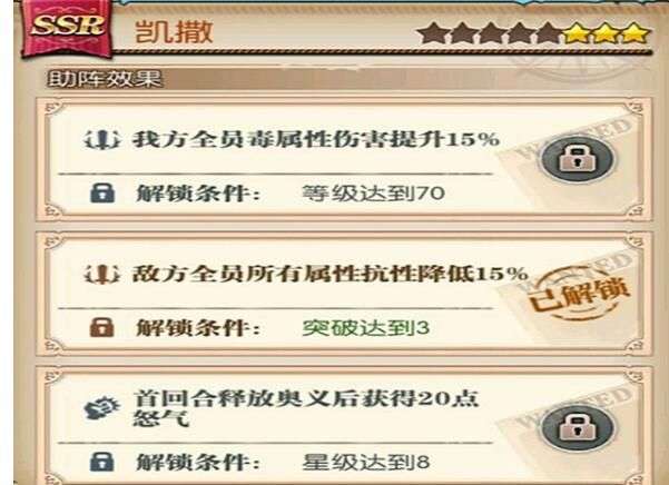 凯撒刷剧情可以入手,技能主打的是单体技能,有奥义延伸,优先攻击前排。而且有保命有增伤。当然,最关键的是除了凯撒其他的兑换没什么诱惑力。凯撒助战方面增加毒伤、降低敌方属抗,以及首回合奥义后增怒。