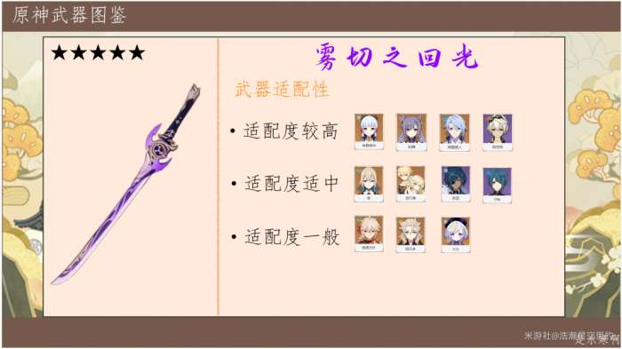 高基础攻击力,副属性高贵的暴击伤害,再加上被动带来的元素伤害加成,使得雾切成为了目前原神里少有的高泛用性的五星限定武器。雾切适用于物理输出之外的各种主C和副C,武器适配性高,并且未来表现估计同样优秀。因为作为一个非物理输出的角色,攻击附魔基本上都是输出角色的标配了;能做到普攻附魔的,就能吃到满层雾切的被动。