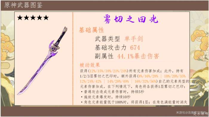策划基于武器的平衡性考虑,同星级的武器,基础攻击力高的副属性值就相应设置得低些,雾切副属性的爆伤才44.1%,和绿剑是相反的配比。