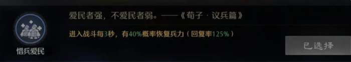 如果是为徐庶搭配兵法的话,这里依旧是有两个选择,首先第一个选择是惜兵爱民这个兵法,这个兵法给徐庶搭配的时候,只要他进入了战斗当中,每3秒的话就可以触发一次,此时的话,会有40%的概率可以给学术带来足够的兵力恢复,概率百分比也非常高,这里达到了125%的恢复数值,所以对于徐庶他在这个阵容当中的持续效果来说是非常有好处的,第二个就是乐善这个兵法,这个兵法相对来说其实是给他自身带来续航能力的,根据他本身的能力可以造成的治疗效果上面会提升10%的数值,对于徐术这样的角色来说,它带来10%的效果虽然不高,但是在整体阵容当中没有其他的武将有恢复类型的效果,所以在这里给他搭配这个兵法的整体效果,就是可以提升阵容当中需要的续航。