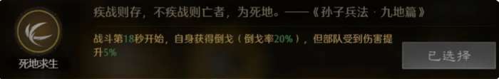 最后就是黄忠他在兵法的选择上面可以搭配的是死地求生这个兵法,这个兵法在其中主要带来的效果就是战斗当中,只要是达到18秒的情况下,大家还存活的话,那么黄忠自身会获得一个倒击倒戈的玩法,倒戈概率的话达到的数值是20%,但是此时如果我方的部队受到敌方伤害的话,那么这里的伤害数值会提升5%,所以在使用黄忠这个兵法的时候,要有一定的取舍才可以,其次如果不用死地求生这个兵法的话,也可以给黄忠搭配奋鼓,这个兵法跟上面关羽带来奋鼓的这个兵法效果是一样的。