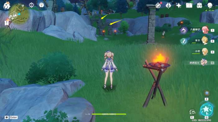 (30号)在29号点位转东方向视角,朝着不远处石柱子冲刺前进,在石柱子前方篝火旁有1个钩钩果