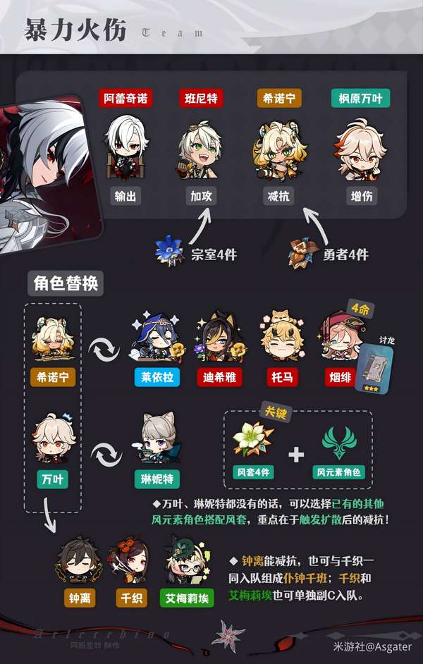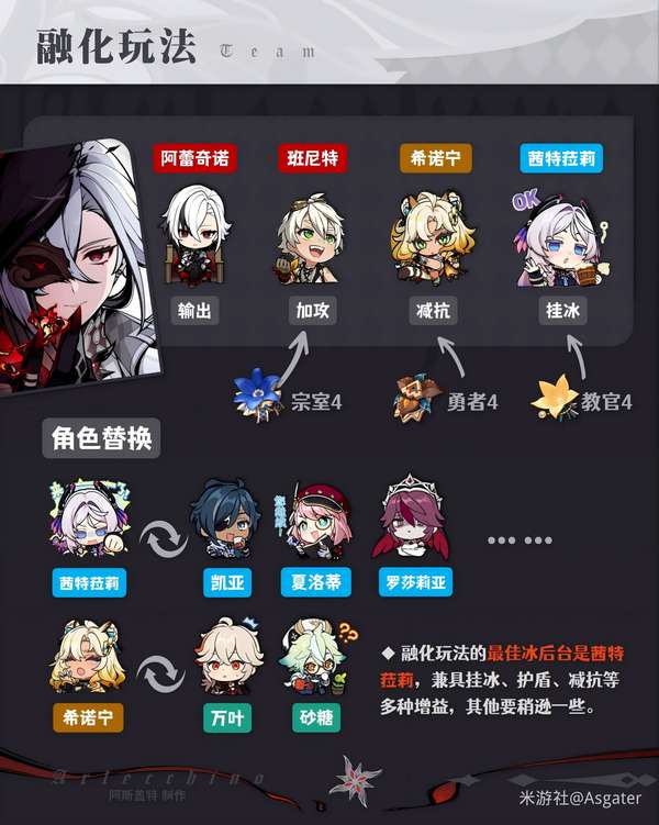 ③ 优先搭配希诺宁、万叶、砂糖等,也可选两名冰后台配合挂冰,但在增益方面肯定有所折扣。