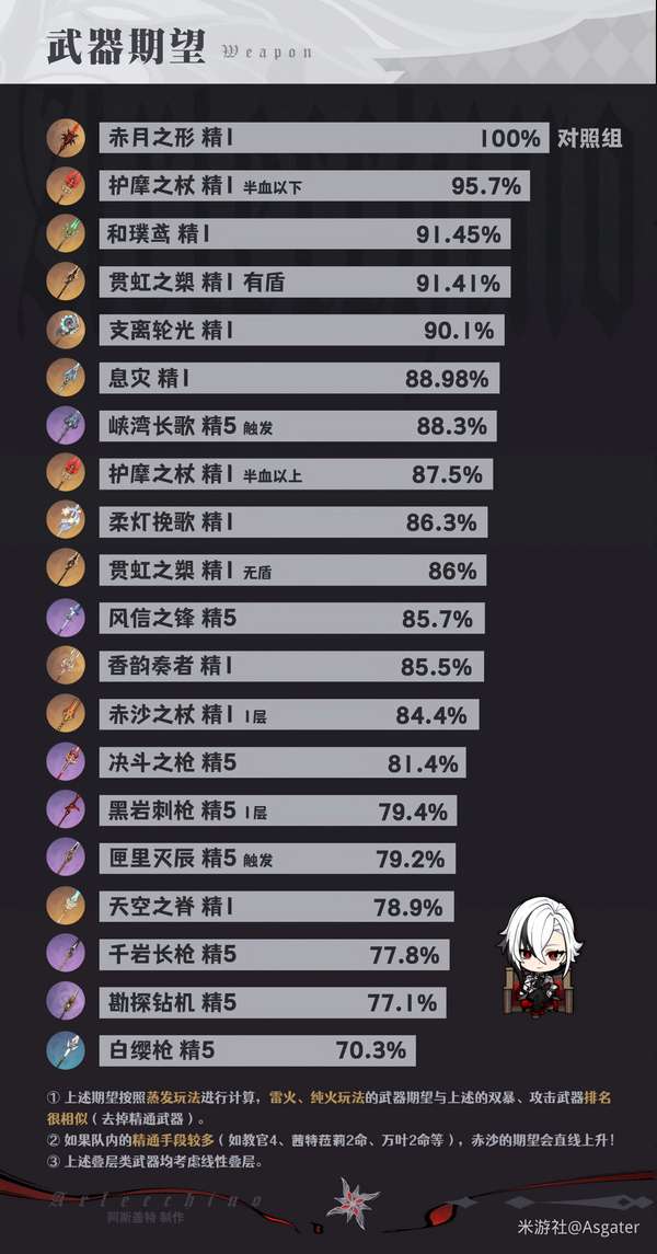 【tips】在搭配班尼特、云堇等能够提高基础倍率区间数值的辅助角色后,像息灾、贯虹之槊这类提供大量攻击力加成的武器的排名将有所下降,而像护摩、赤沙、峡湾等提供双暴的武器的排名会有所上升。