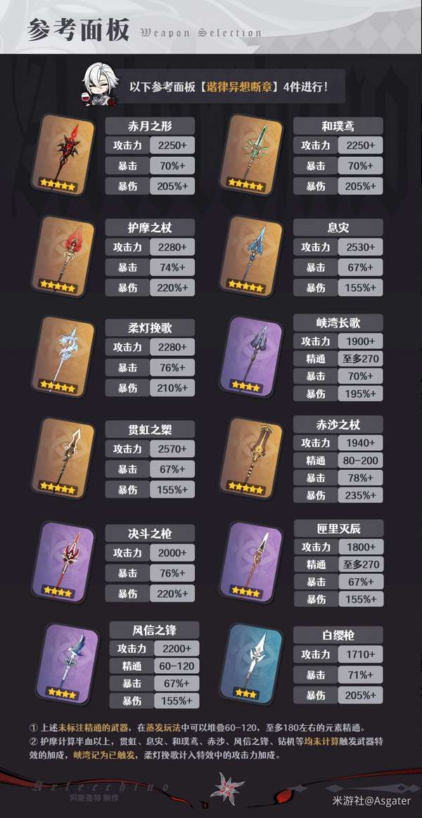 ② 当不搭配班尼特、云堇等提供基础倍率数值的角色时,可按照上方武器对比排名进行选择;反之优先考虑具有双暴的武器。