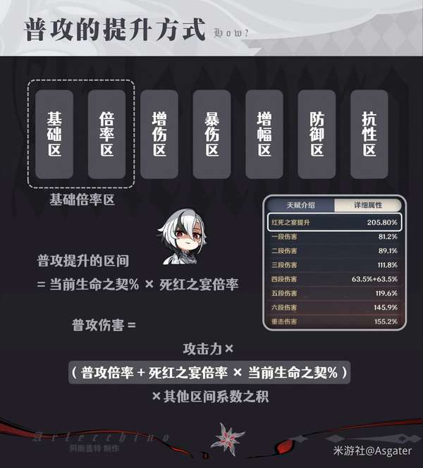 ◆每一次普攻命中后都会消耗一次当前7.5%的命契——其实,每次普攻伤害是固定的,因为每次普攻命中都会按照当前生命之契%进行结算,每次结算的命契%都是一个固定值,所以得到的普攻提升也是固定值,因此每轮输出的普攻总倍率其实也是固定的。