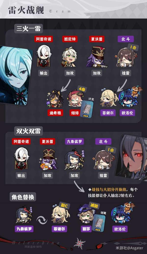 ③ 因为仆人能站场附着火元素,所以需搭配一位能持续挂雷的队友,如北斗、菲谢尔、欧洛伦、雷电将军等。