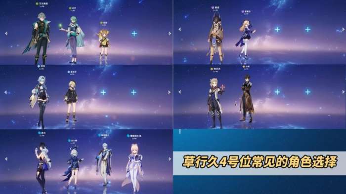 草行久在选择4号位的角色时,可以从以下5类中选取:草系角色如艾尔海森、瑶瑶、白术;雷系角色赛诺、菲谢尔;冰系角色优菈、菲米尼,其中冰可以触发超导减物抗,同时可以消耗过量水增加激化效率;岩系角色钟离、阿贝多;水系角色夜兰、神里绫人、珊瑚宫心海、芙宁娜。