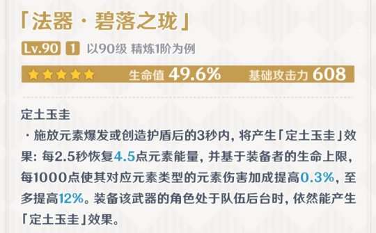 碧落之珑的第一个武器特效对心海的加成并不是很高,但是第二个武器效果,即生命值带来的元素伤害加成,是最适合心海的效果,甚至比月华的效果都更好。