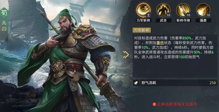 接下来就是关羽这个输出上面有突出能力的武将,其实很多玩家在以重伤为主要玩法的时候就可以了解到,这里关羽的能力上面是可以带来一定重伤机制的,所以后期大家玩蜀国的阵容时,大部分情况需要重伤的能力时就要用关羽作为主讲,其实他自身在物理爆发能力上面也不弱,大家组成五虎将前期开荒也是有足够强度,所以在输出方面考虑的话,其实关羽的多方面能力大家都是有不错的强度可以考虑。