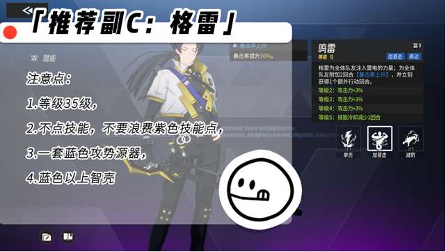 炼负责队伍主要输出,格雷负责给予对面减防和给队伍进行暴击增益,同时可以作为副C,进行补伤,卡奇负责拉条让炼进行多动,多乐丝负责队伍生存,在主C半血时记得使用单体或者大招进行群体回复。