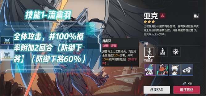 技能一(流禽羽):全体攻击,并100%概率附加2回合【防御下将】(防御下将60%)