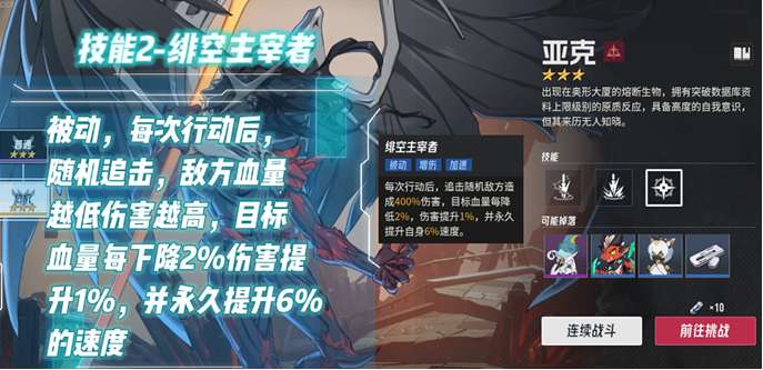 技能三(绯空主宰者):被动,每次行动后,随机追击,敌方血量越低伤害越高,目标血量每下降2%伤害提升1%,并永久提升6%的速度