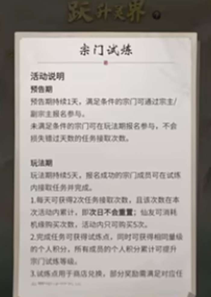 宗门试炼是一念逍遥中一项以宗门为单位开启的团队活动,要求宗门成员数量达到10人以上方可开启。活动开启后,所有宗门成员均可在活动界面报名参与。报名成功后,玩家可在任务列表中领取专属的试炼任务,这些任务类型多样,涵盖日常修炼、战斗挑战、资源采集等多个方面。每位成员完成任务后,将获得个人积分和试炼点奖励,为宗门整体进度贡献力量。