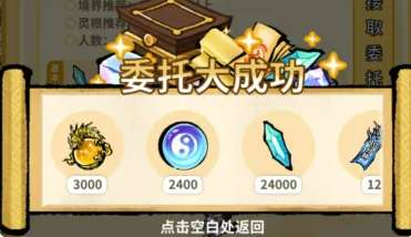 第二个是委托板。委托板主要用来拿五色奇物,灵石产出不多,但前期可以作为补充来源。委托任务是稳定成功的,满足灵根和境界要求的弟子去做委托可以大成功拿双倍收益,效率高一些。如果手里有性格偏向喜欢委托的弟子,可以留着专门跑委托,加快速度。