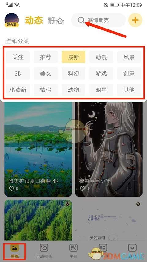 1、打开元气动态壁纸app,进入动态壁纸界面,包括【推荐】、【风景】、【科幻】、【游戏】、【小清新】、【情侣】等壁纸分类,用户可根据喜欢进行选择,也可以选择【放大镜】图标进行壁纸搜索,