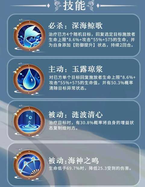 【特点】必杀技能可以治疗4个目标,0怒单体治疗技能带净化效果,每次治疗都有几率复制增益BUFF给己方。