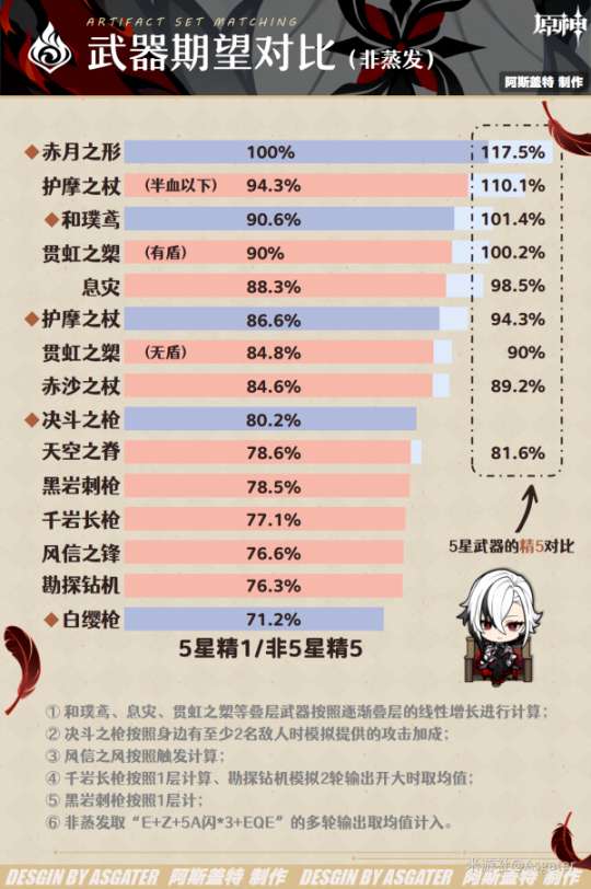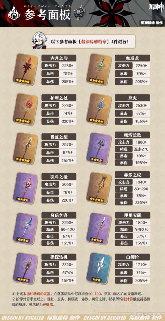 【tips】在搭配班尼特、云堇等能够提高基础倍率区间数值的辅助角色后,像息灾、贯虹之槊这类提供大量攻击力加成的武器的排名将有所下降,而像护摩、赤沙、峡湾等提供双暴的武器的排名会有所上升。