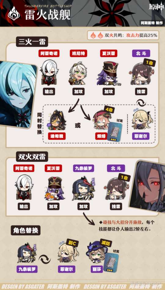 ② 选择单雷北斗时的阵容比较单一,第3名火角色更多是班尼特。