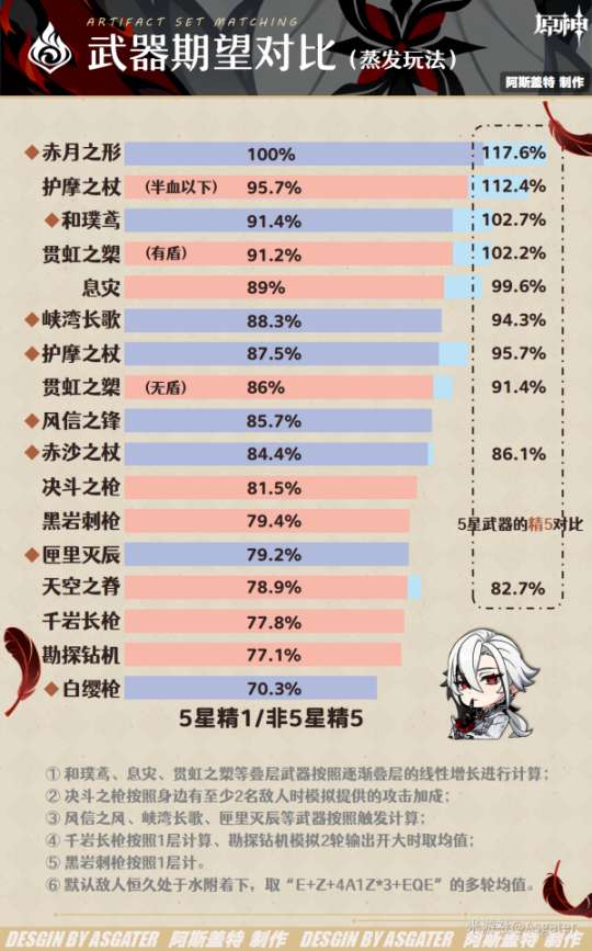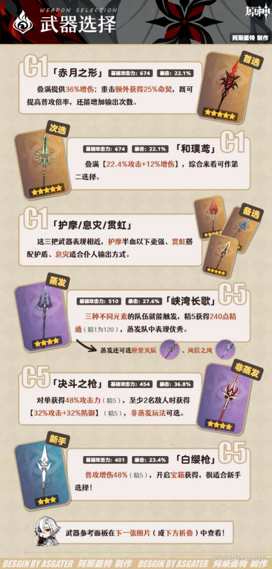 ◆武器选择大同小异,很多5星武器在不同流派都可选择,蒸发玩法可考虑精通类武器。
