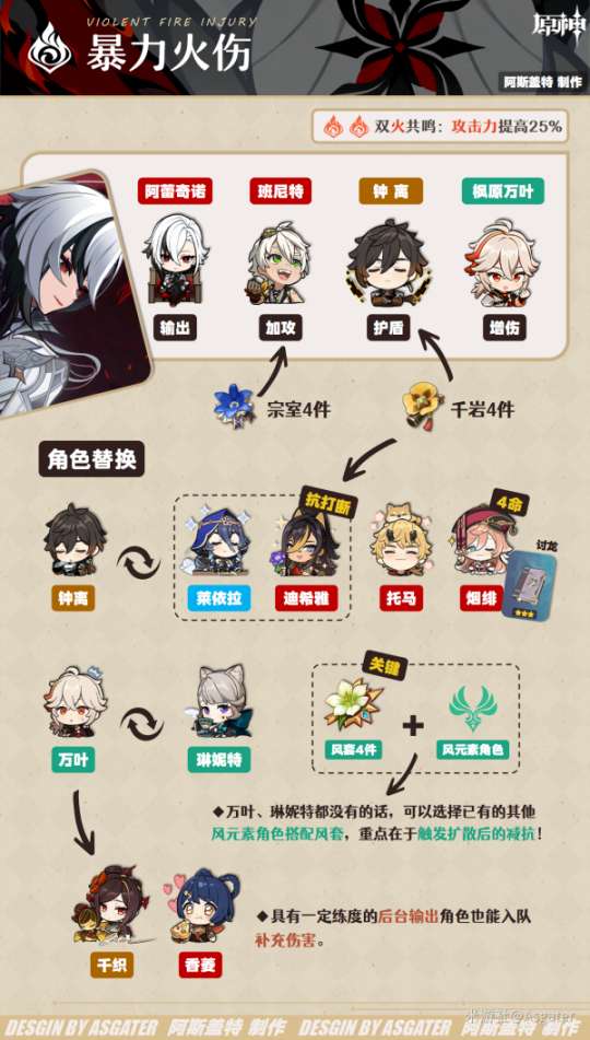 ① 护盾(钟离等)换万叶——水火双扩降低抗性提高伤害,但生存压力上升,需谨慎选择。(还是推荐大部分旅行者带护盾角色)