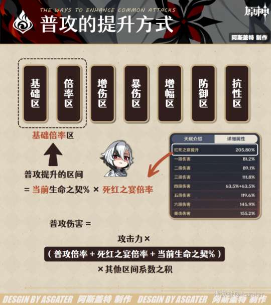 每一次普攻命中后都会消耗一次当前7.5%的命契——其实,每次普攻伤害是固定的,因为每次普攻命中都会按照当前生命之契%进行结算,每次结算的命契%都是一个固定值,所以得到的普攻提升也是固定值,因此每轮输出的普攻总倍率其实也是固定的。