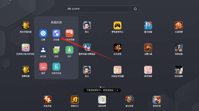 三、安装好后模拟器后,我们找到系统应用那个文件夹,找到浏览器,把游戏官网下载地址(jzpxyx.com)复制到浏览器搜索,找到你想玩的游戏下载就可以了。