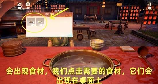 进入煮火锅页面后,我们得知素婆婆需要的菜,然后点击左边的食盒,会出现几盘菜,点击需要的,会出现在桌面上,